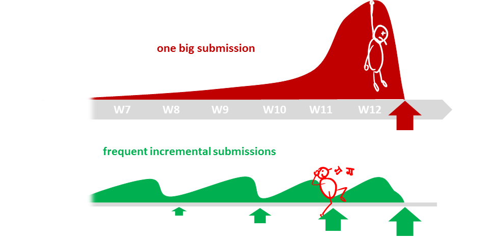The high number of submissions is not meant to increase workload but to spread it across the semester. Learning theory and applying them should be done in parallel to maximize the learning effect. That can happen only if we spread theory and 'application of theory' (i.e., project work) evenly across the semester.