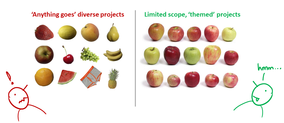 But, wider scope → more diverse projects → harder for us to go deep into your project. The collective know-how we (i.e., students and the teaching team) have built up about SE issues related to the project become shallow and stretched too thinly. It also affects fairness of grading.