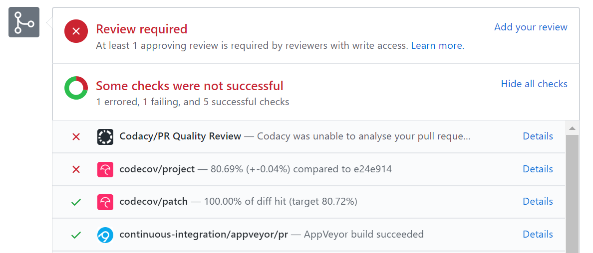 Do not merge PRs failing . The CI status of a PR is reported at the bottom of the conversation tab of the PR page. Here's an example: