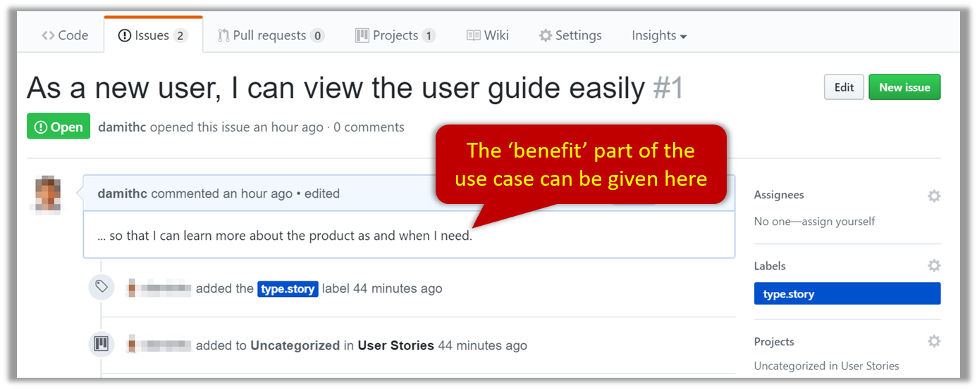 In our project, we use user stories to track user requirements. Instead of using a separate tool for tracking requirements, we can use the GitHub issue tracker for this as well. To do that, record each user story as an issue in the issue tracker. More details (taken from the textbook) are given below.