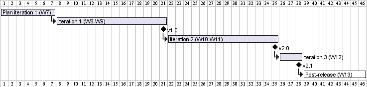 Start implementing v1.0, by adding code in small steps, while working in parallel, aiming to produce a VERY simple working version after one week, and a bit more functional version at the end of iteration (i.e., after two weeks).
