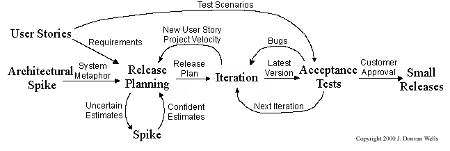 XP has a set of simple rules. XP is a lot like a jig saw puzzle with many small pieces. Individually the pieces make no sense, but when combined together a complete picture can be seen. This flow chart shows how Extreme Programming's rules work together.