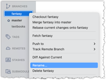 git branch -m fantasy fantasy-books # rename local branch