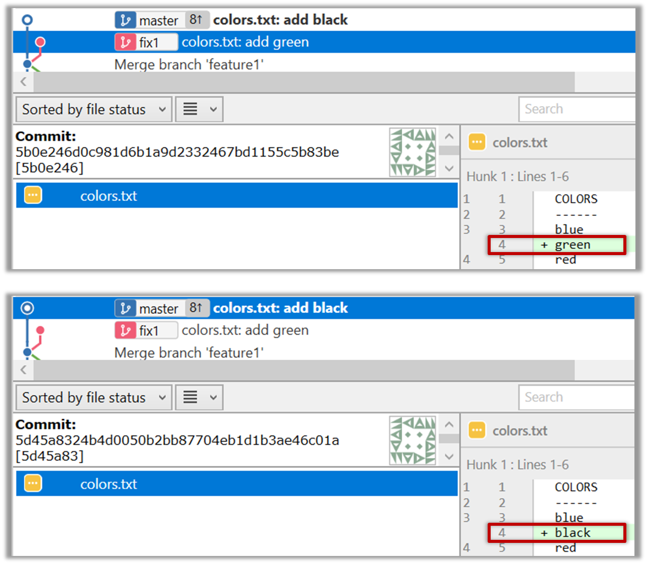 5 Resolve the conflict by editing the file. Let us assume you want to keep both lines in the merged version. You can modify the file to be like this: