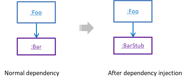Dependency injection is the process of 'injecting' objects to replace current dependencies with a different object. This is often used to inject stubs to isolate the from its so that it can be tested in isolation.